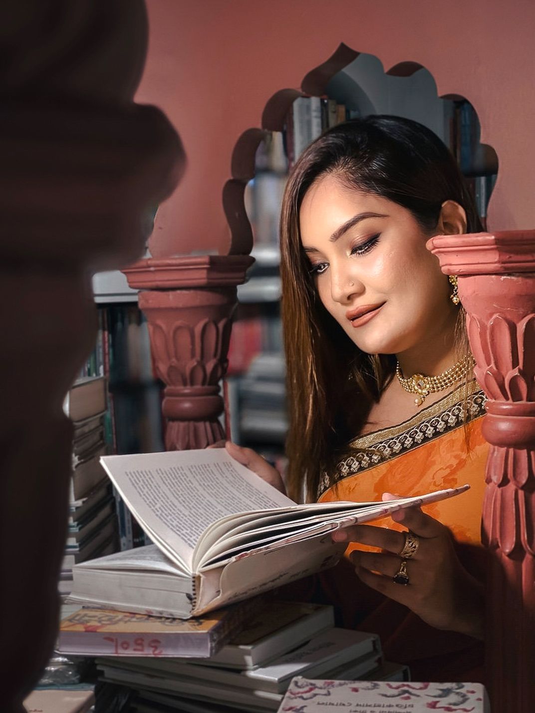 Draped in orange, surrounded by stories— she reads not just words, but echoes of time.