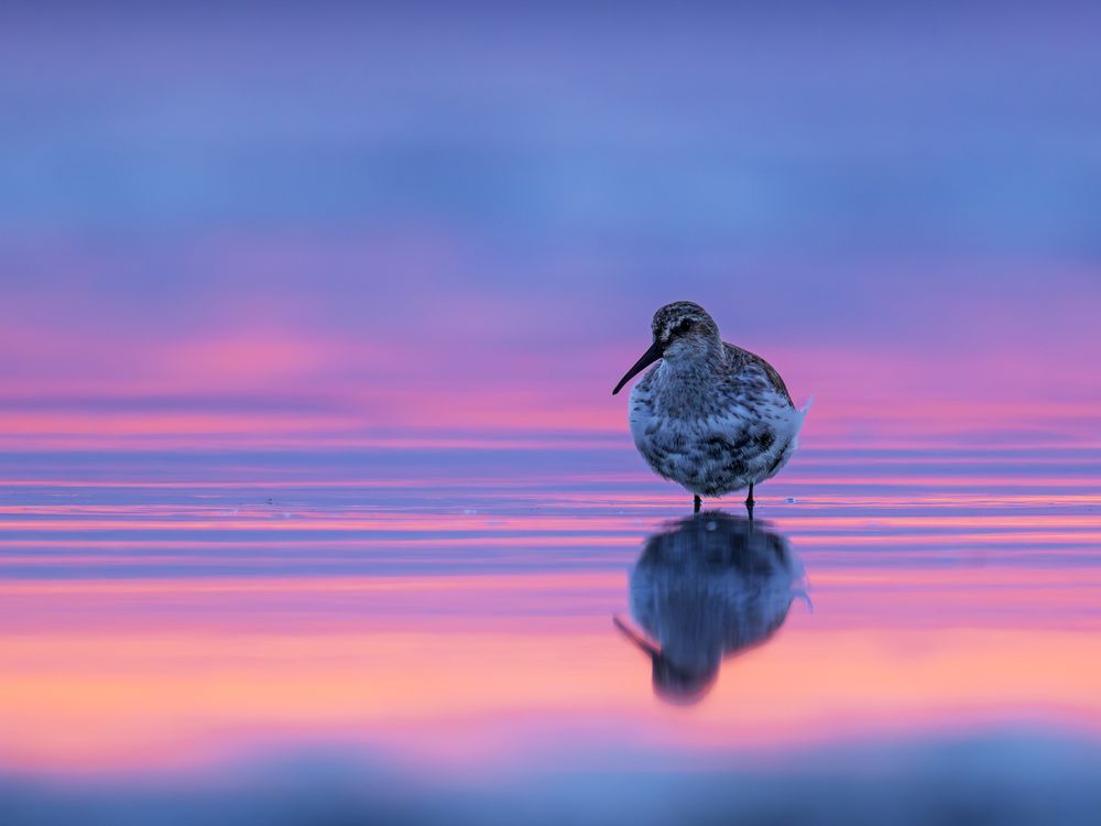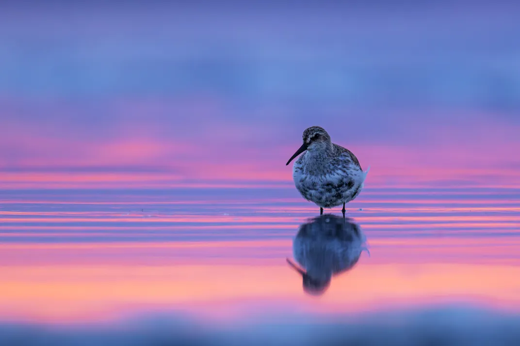 The photo shows dunlin (Calidris alpina) illuminated by the special blue-hour light of a late-summer sunset. The soft, pastel tones of the blue hour blend with the fading warmth of the day, creating a serene and almost dreamlike atmosphere around the bird.