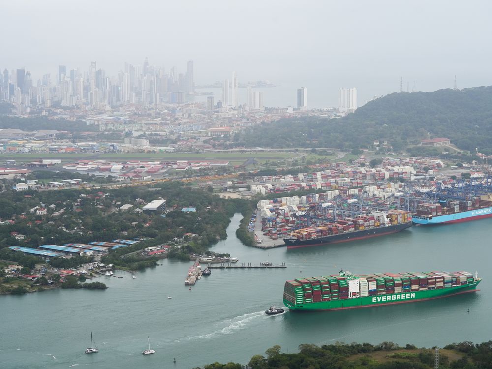 An aerial view shows a container ship transiting the Panama Canal and exiting on the Pacific side, with Balboa Port and Panama City visible in the background.