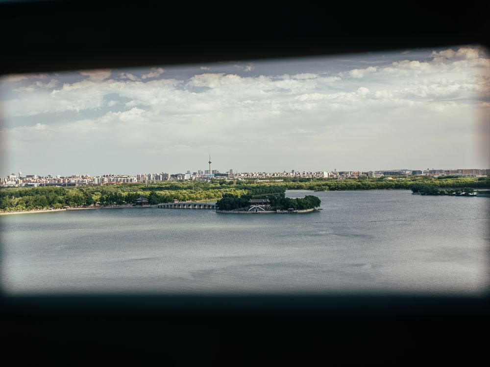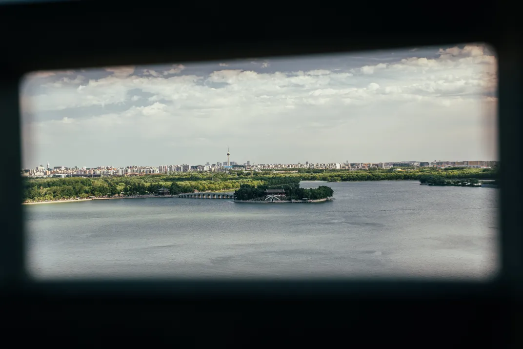 Through an ancient window's lens, Beijing unfolds in layered poetry. A placid lake foregrounds the Summer Palace's pagoda, perfectly centered, while the modern skyline emerges as a panoramic backdrop: a single frame holding past, present, and perpetual grace.