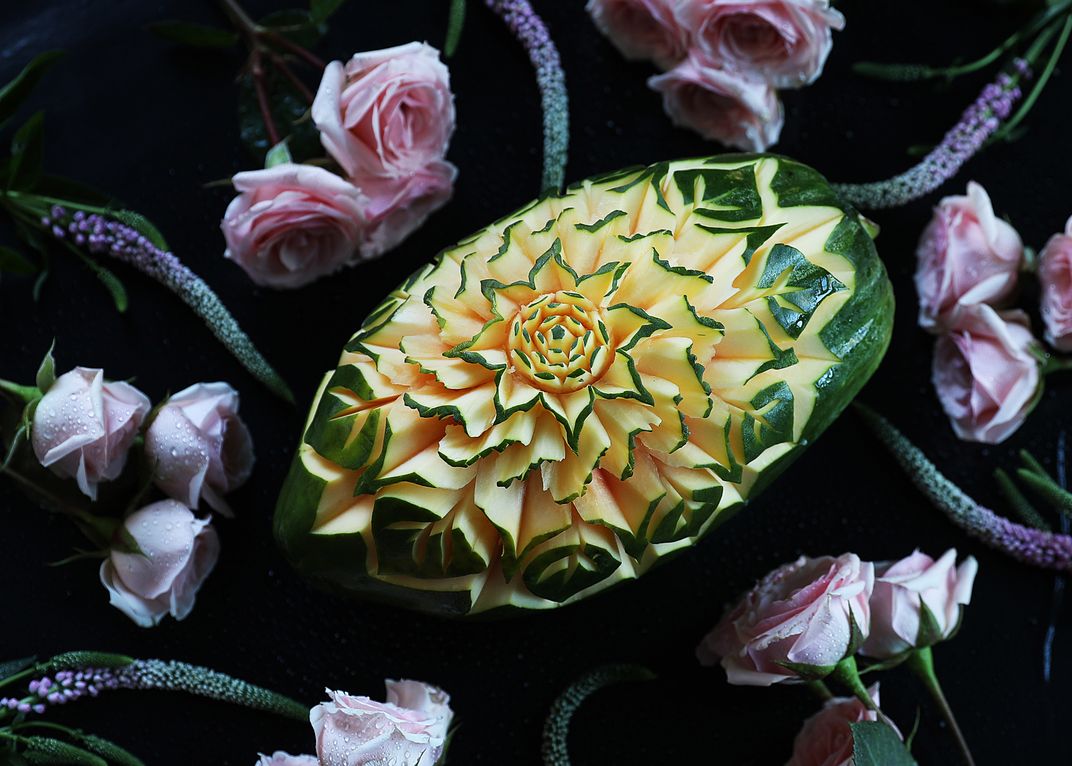 Carved papaya surrounded by pink roses, showcasing intricate hand-craft, traditional Thai art and natural beauty.