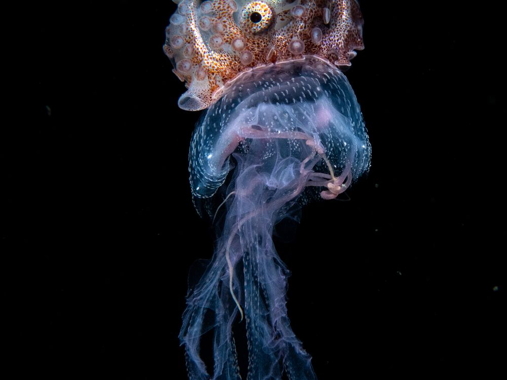 Paper Nautilus Hitchhiking on Jelly Fish