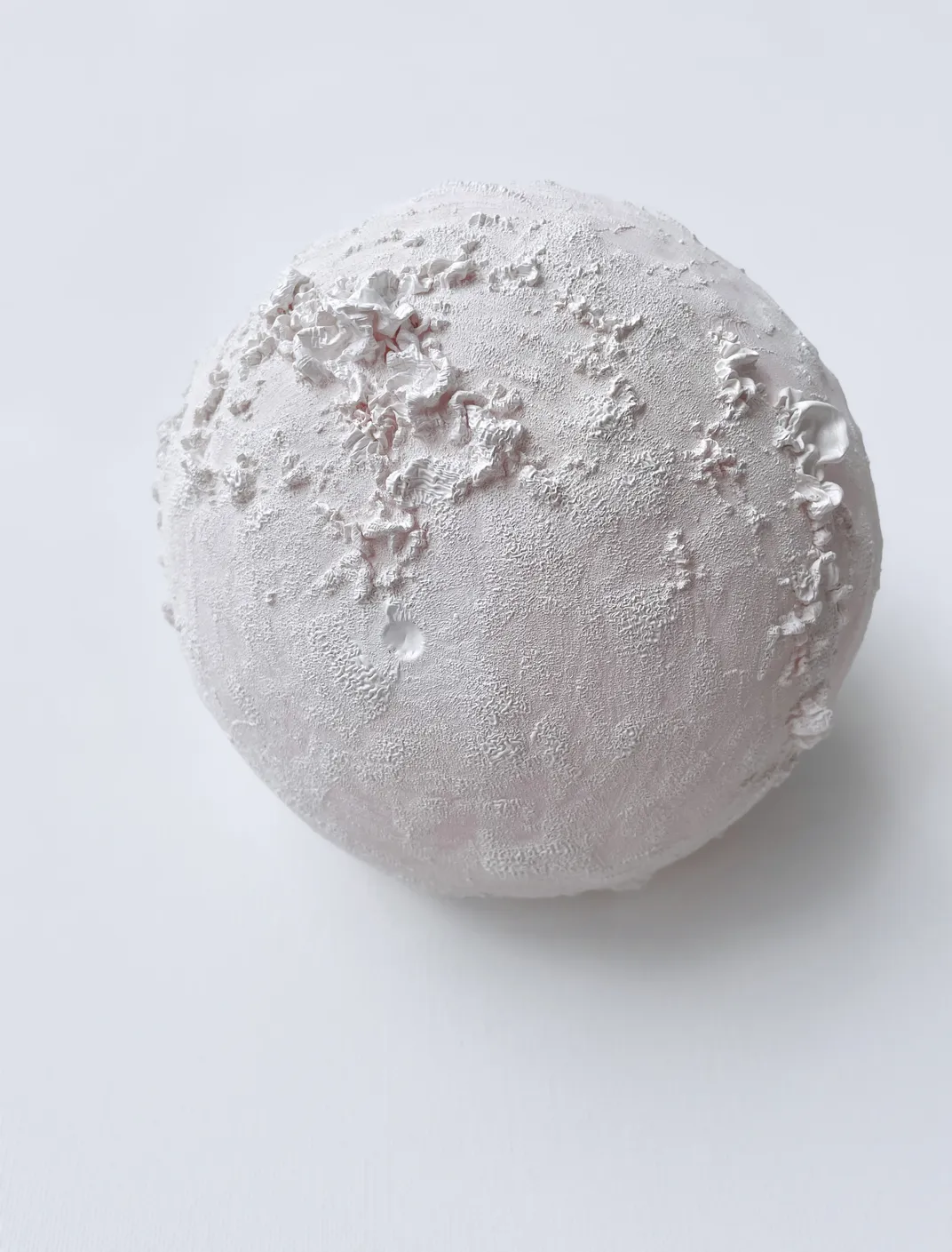 The artwork is a photography of a small art installation. It features a textured sphere, evoking the duality of pregnancy. Its intricate surface resembles the landscape of a mysterious planet while also suggesting the growth of a fungal colony (a new life form thriving on an existing organism). This piece explores the paradox of creation: the fetus as both a miraculous new world and a parasitic entity. While the developing life is a marvel, it survives by extracting resources from the mother's body, indifferent to the toll on its host. The work highlights the complex and raw interdependence between mother and child during pregnancy. This artwork is part of a large art project called “Fragile Beginnings” about the complexity of motherhood and the sanctity of human life.