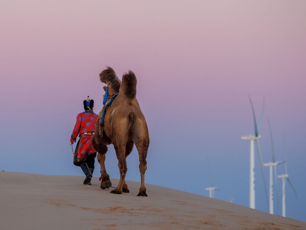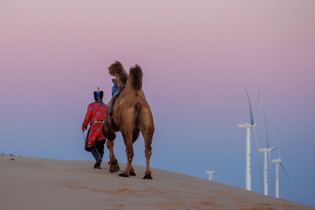 A Mongolian herdsman with traditional attire walking his camel on the sand dune in blue light, and wind turbines on background. He may still able to wear the tradition cloths but his village will be rapid change forever.