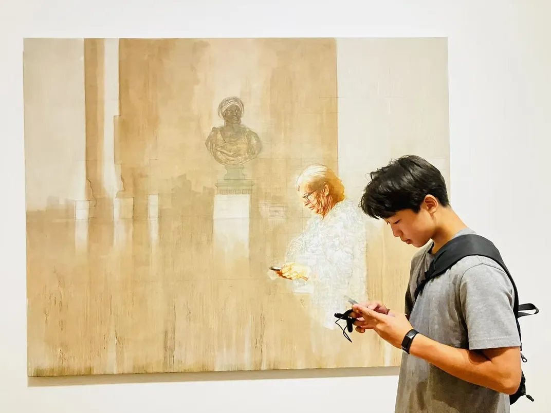 A young man, engrossed in the digital world of his phone, stands before a painting. The artwork itself merges an antique bust with the faded, spectral image of an elderly woman also looking at her phone. The juxtaposition of the modern viewer and the figures in the painting collapses time, suggesting a shared human experience across generations and eras, one now mediated by technology. The image explores themes of connection, reflection, and the way we engage with history and art today