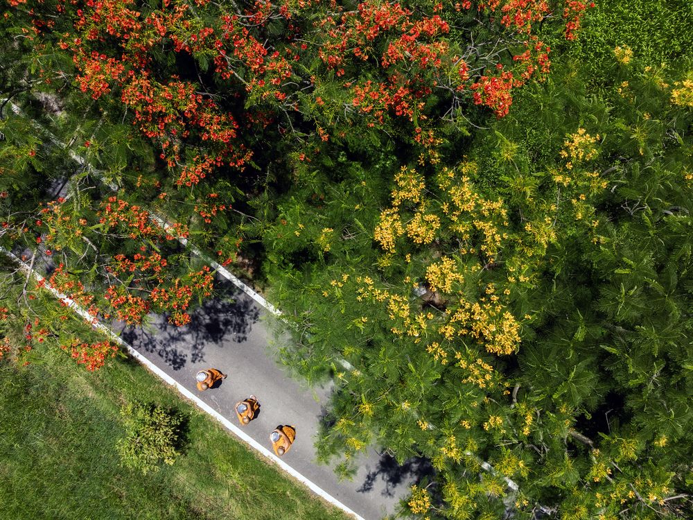 Captured from above, this aerial moment shows three novices walking along a diagonal path surrounded by lush greenery and beautifully arching trees. The natural patterns, gentle colors, and rhythmic movement create a quiet harmony, offering a peaceful glimpse into daily life from a unique perspective.