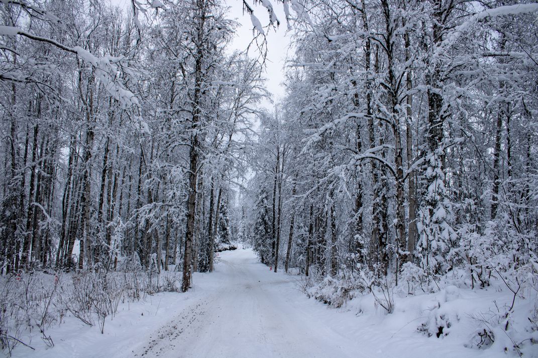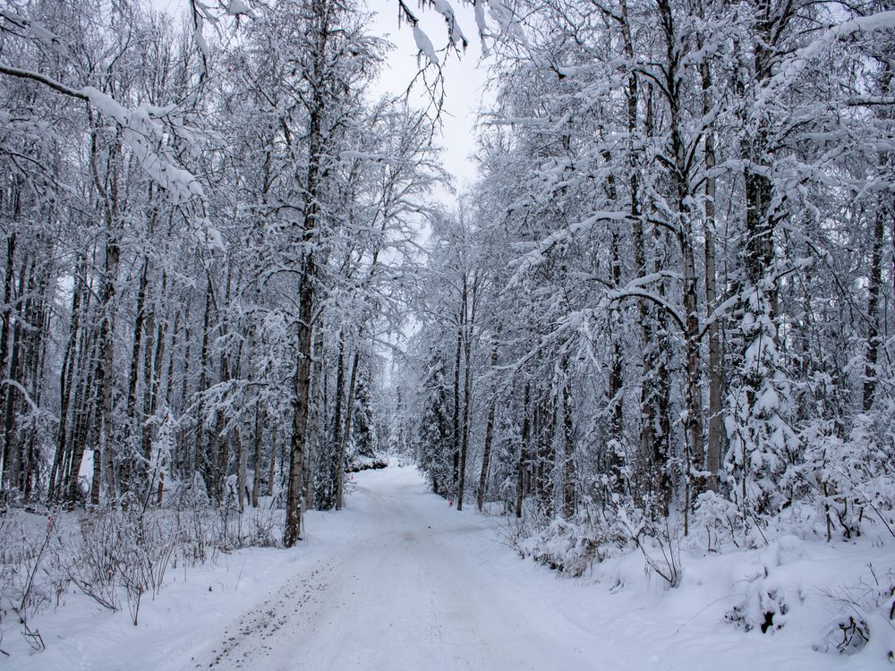 A narrow road cuts quietly through an Alaskan forest after a fresh snowfall. Every branch is coated in white, softening the landscape into complete stillness. In the deep cold of winter this path becomes a rare moment of solitude, a glimpse of the quiet, enduring beauty that defines the far north.
