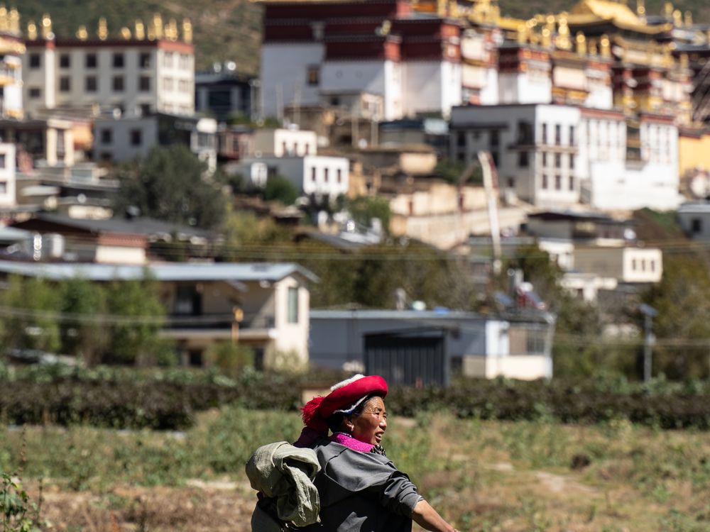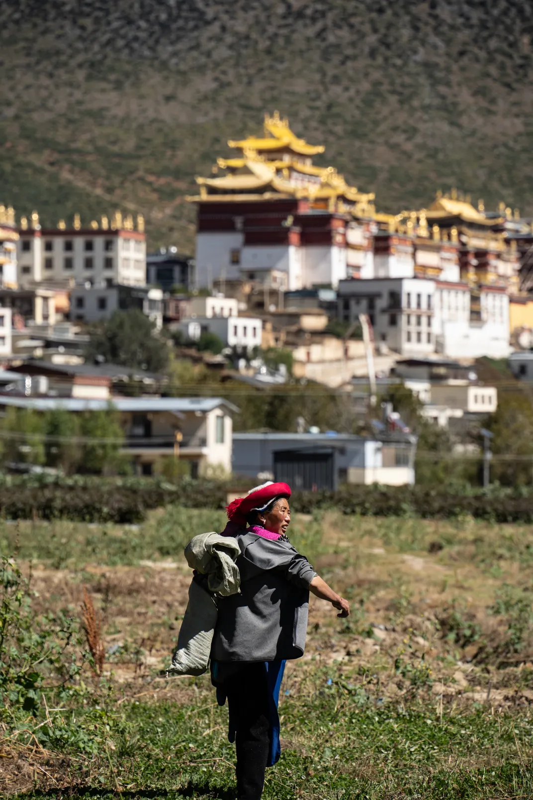 Ganden Sumtseling Monastery, known as the "Little Potala Palace" and one of the largest Tibetan Buddhist sites in the Kham region, stands as a spiritual fortress. In this context, a local farmer is captured walking from the secular field toward the monastery. Her action embodies the direct permeation of daily labor and spiritual purpose.