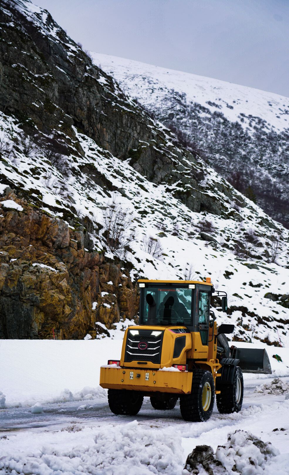 In the stillness of the snow-covered highlands, a bright yellow machine moves through the white silence, shaping a line of passage across the frozen earth.Because of it, road users have a safer driving space, and the warm yellow of the snowplow brings a sense of security and warmth in the snowy world.