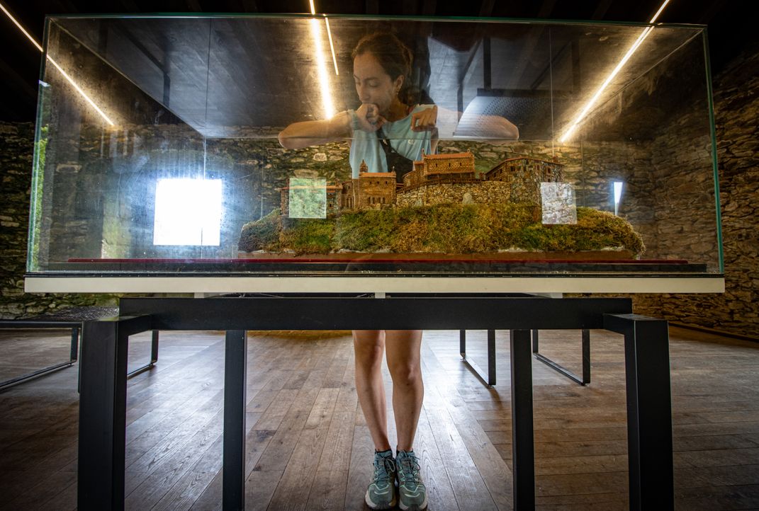 Paula, a licensed architect, reviews a miniature model of the castle in which she stands.