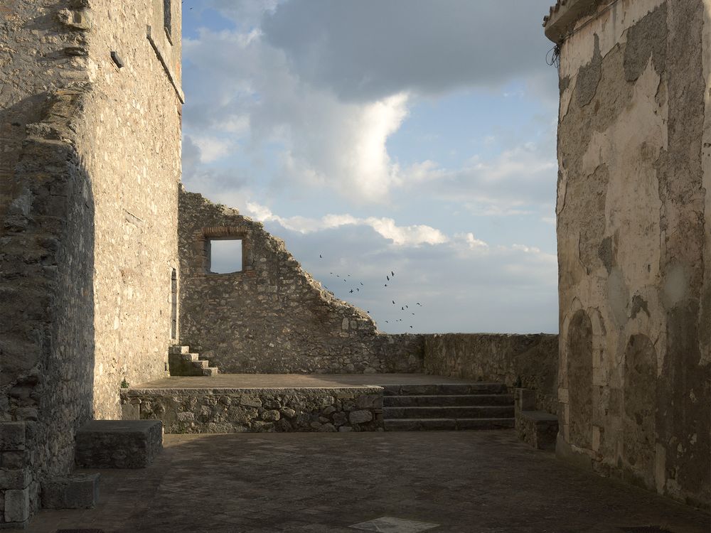 Birds fly among archaeological ruins of Castiglione in Teverina. This village is part of the “Paesaggio Culturale di Civita di Bagnoregio (PCCB)”, a nominated area for Unesco Site 2022 which is characterized by an intense geomorphological activity.