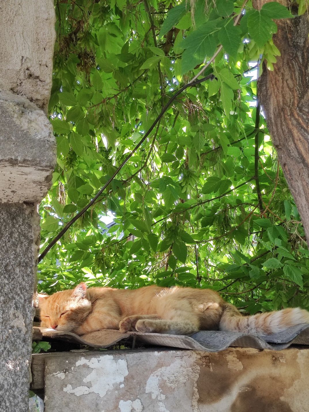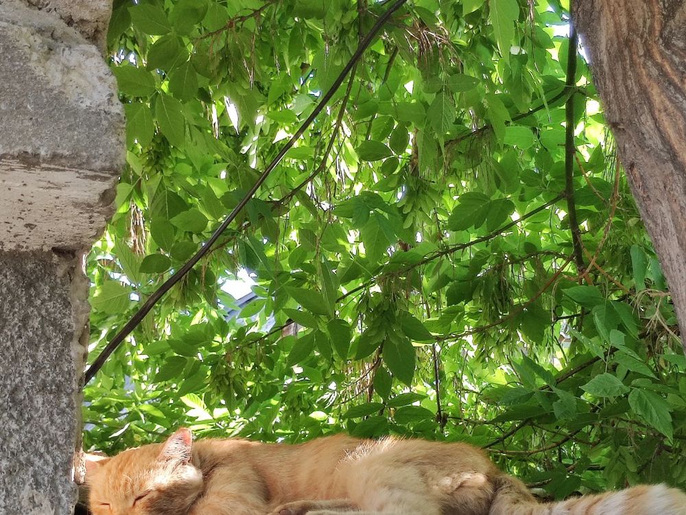 In this serene moment, a golden cat enjoys a peaceful nap under the shade of trees, their branches creating a dappled pattern of shadows. The cat finds repose on a roof, shielded from the direct sunlight. The image captures the tranquility of the scene, where nature's shadows and the cozy perch provide the perfect setting for a restful cat nap in the gentle embrace of a sunny day.