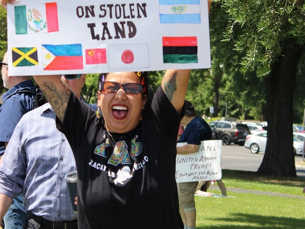This is a woman who was pew filling protesting holding a sign proudly reading “No one is illegal on stolen land”, with different flags around it representing different countries from around the world. The woman is smiling widely and proudly. It was a sunny day perfect for a peaceful protest. This captured a moment of enthusiasm and solidarity for immigrant rights and social justice.