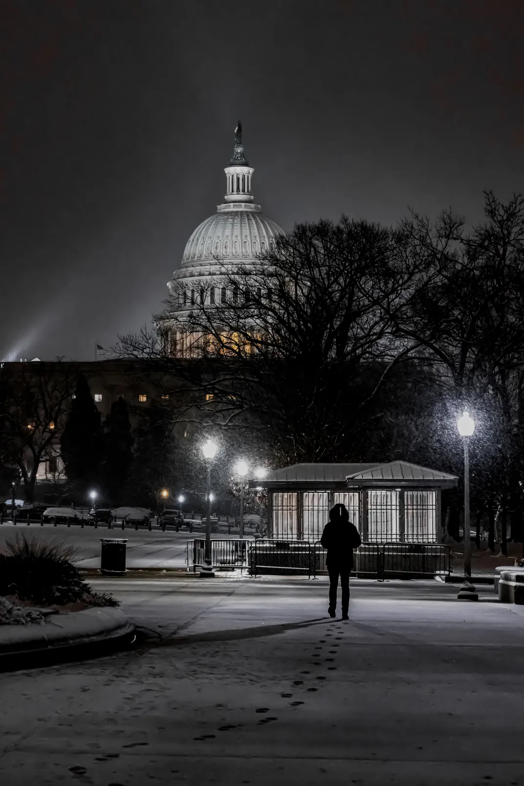 On Martin Luther King Jr. Day, a rare snowfall settled over Washington, D.C. I went out to capture the city in its quietest state. No crowds, no guards—just a lone figure walking toward the Capitol, the scene calm and peaceful under the falling snow.
