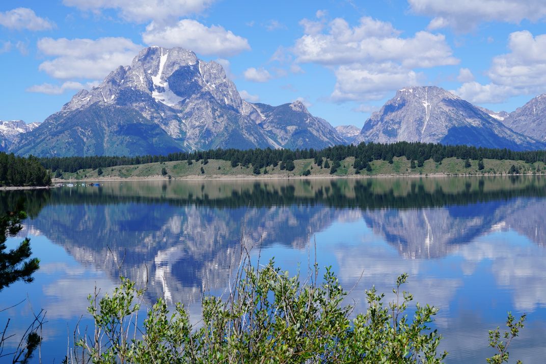 MORNING VIEW AND REFLECTION OF TWO PEAKS IN GRAND TETONS