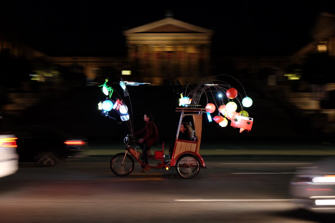Over the Fall, Philadelphia hosted a public exhibition by Cai Guo-Qiang, titled 'Fireflies'. Pedicabs with brightly colored lanterns rode around the Museum district in Philadelphia. This shot, is directly in front of the Philadelphia Museum of Art.