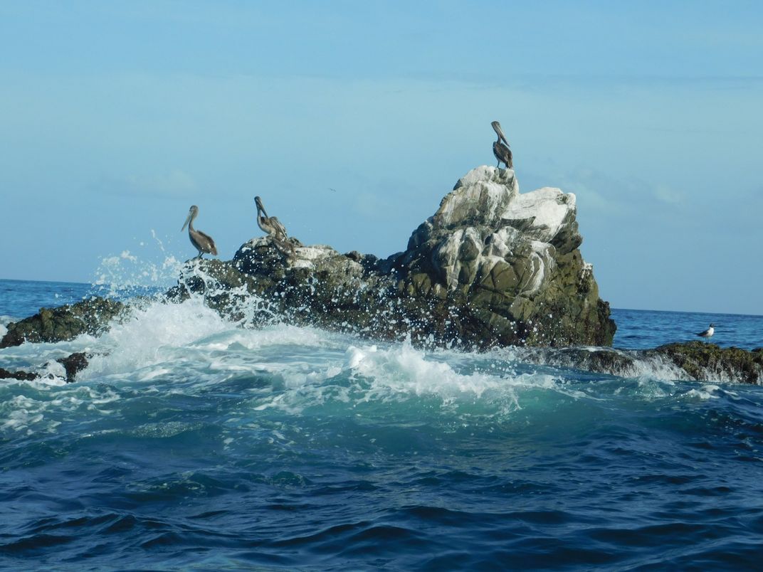 Pelicans relaxing on a rock in Tobago.