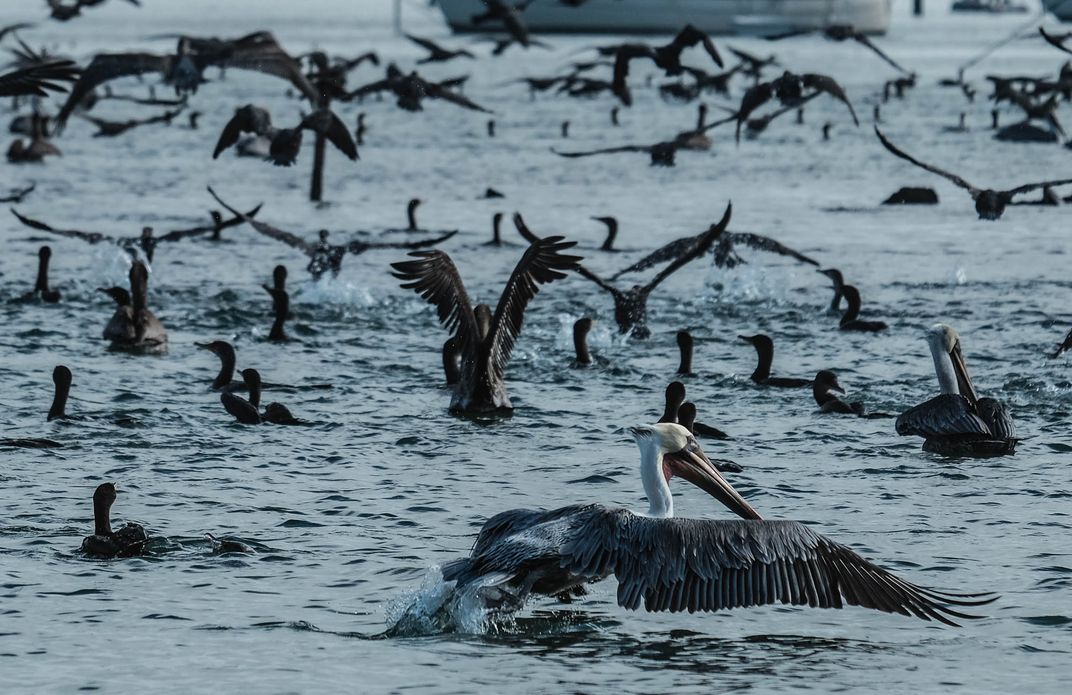 Pelicans and cormorants appeared one morning in very large numbers, at the bay in Sausalito, northern California, just north of San Francisco.