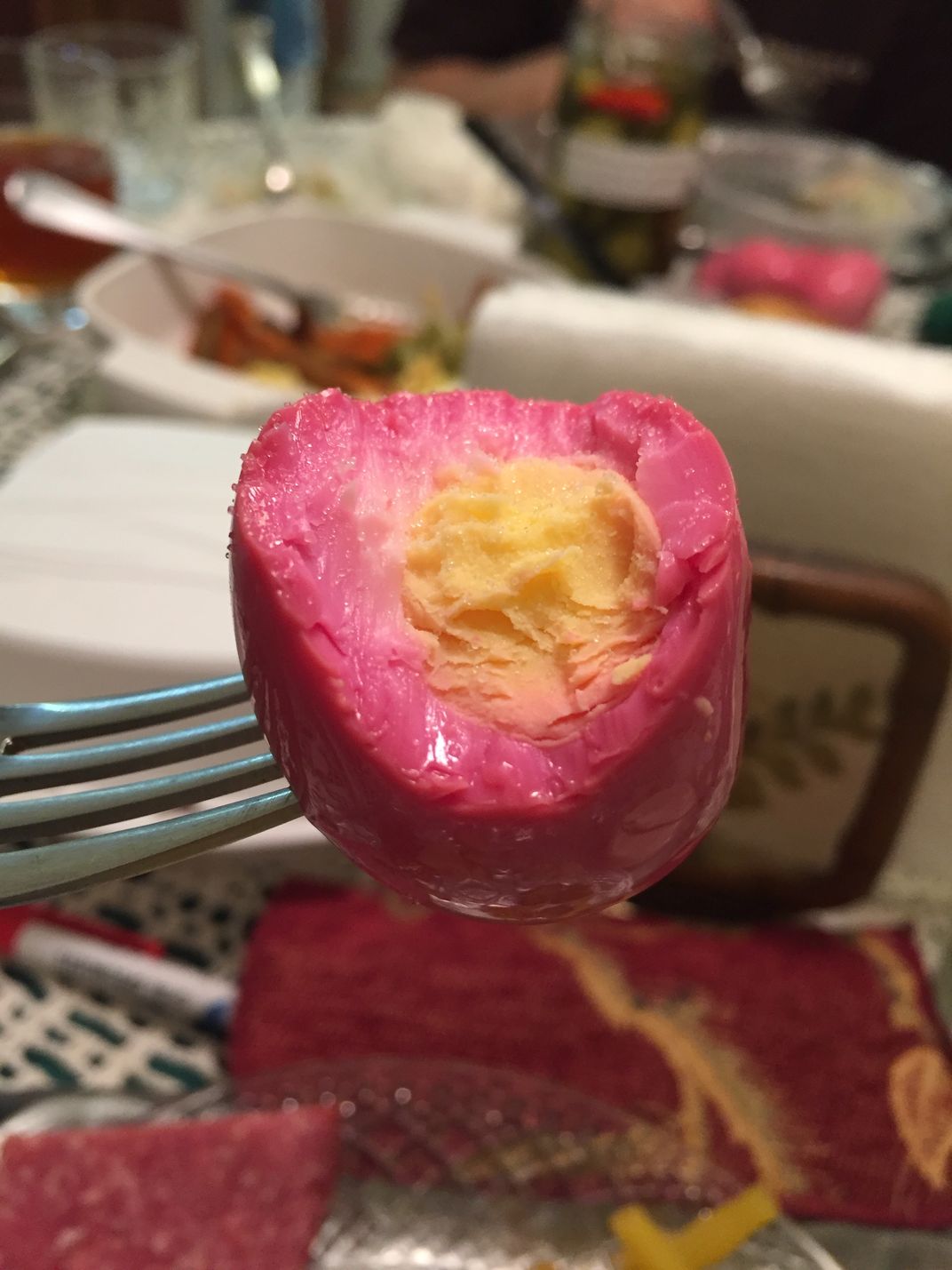 I was visting my grandmother in Lancaster, PA recently. We were eating some authentic Pennsylvania Dutch food that we picked up earlier that day, including this red beet egg from Roots Auction.