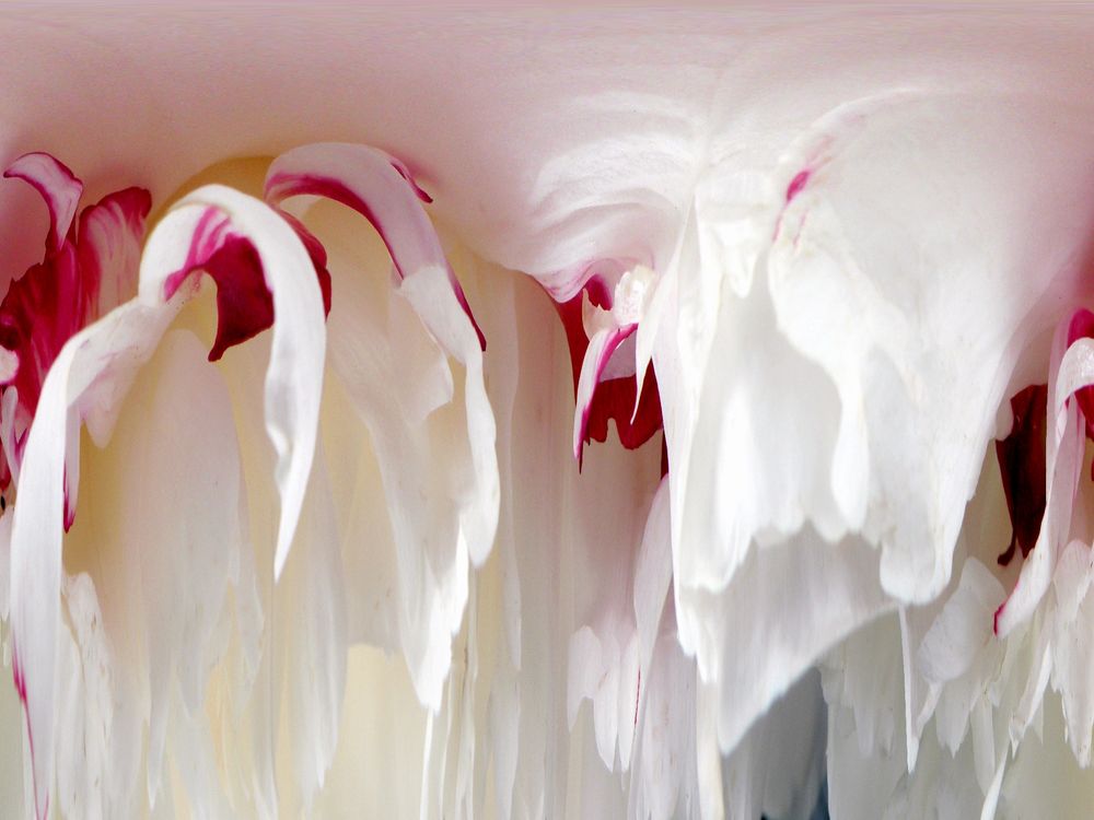 Peony abstract derived from a white and maroon peony flower.