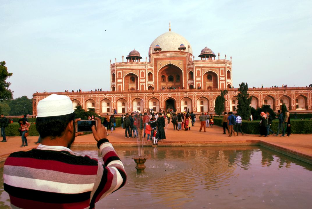 The photo shows Humayun's tomb - a tourist place with fellow tourists