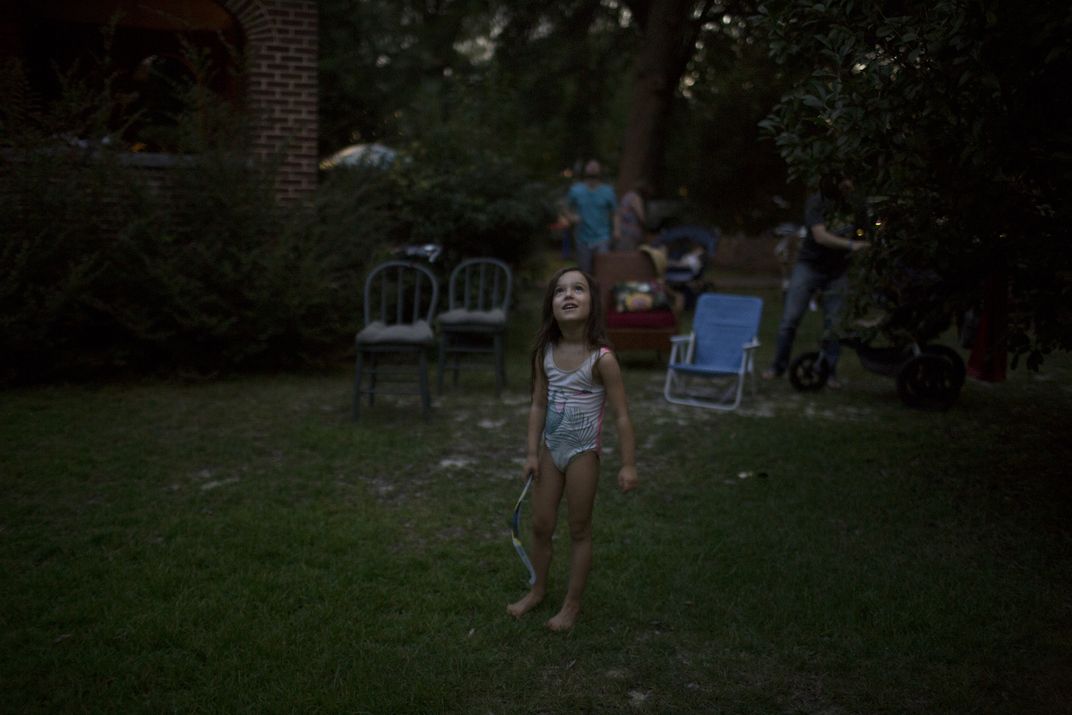 My daughter Pepper, age 5, at our home in Columbia, SC during the August 21 solar eclipse. She has been given permission to remove her protective glasses and view the eclipse at totality as I struggle to choose which vision to behold.