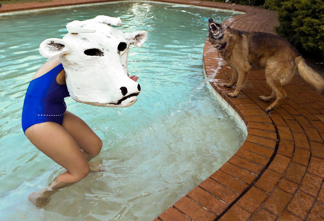 Performance artist, Joni Barnard, poses with for a portrait wearing a bull mask while playing with her landlord's dog, Donna, at the pool in Sandhurst, Johannesburg.