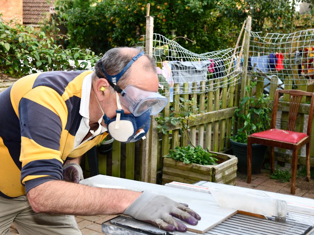 Floor tiles being cut in the back garden. The photo is showing myself operating a tile cutting machine with a diamond wheel. The machine cools the wheel with a bath of water underneath which creates a spray. So I need to wear goggles, ear plugs, breathing mask and gloves. these are all safety requirements.