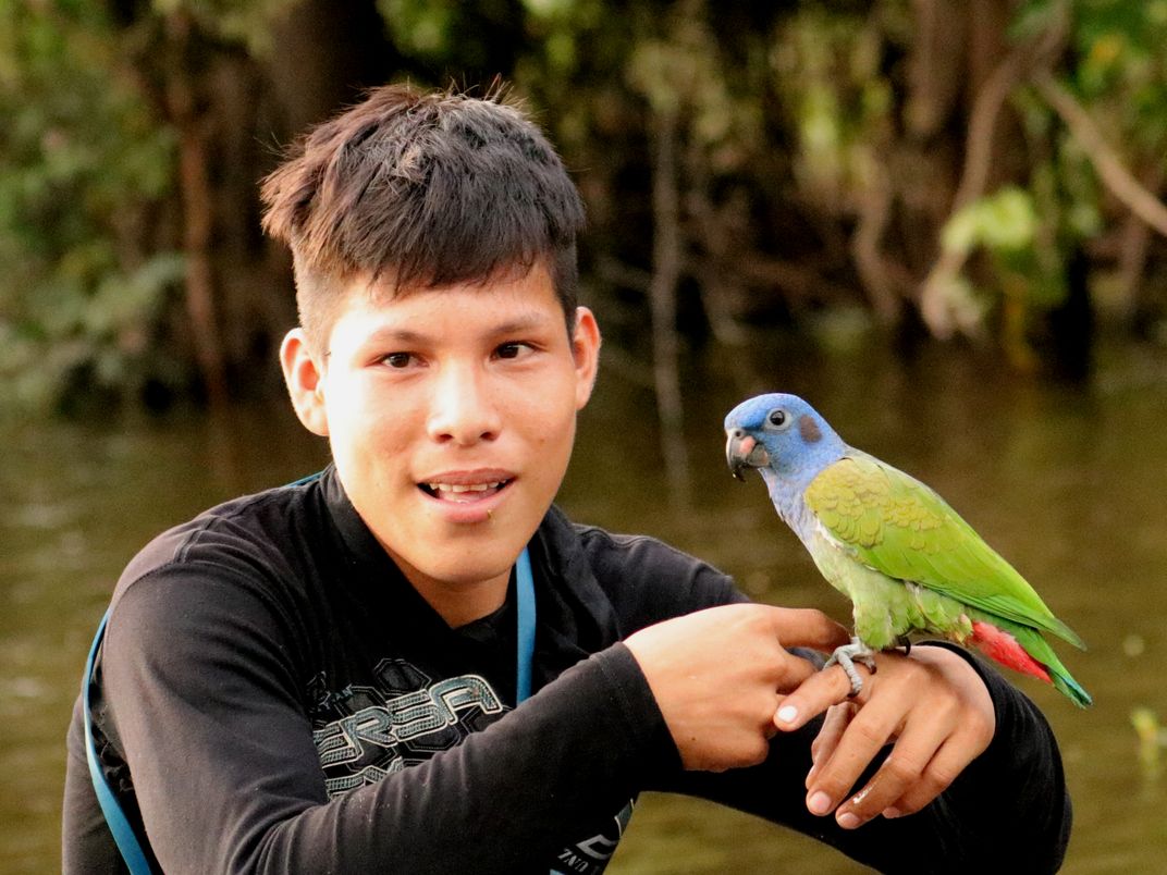 This blue-headed parrot was perched on the shoulder of a boy canoeing in the Peruvian Amazon and the two were clearly devoted to each other.