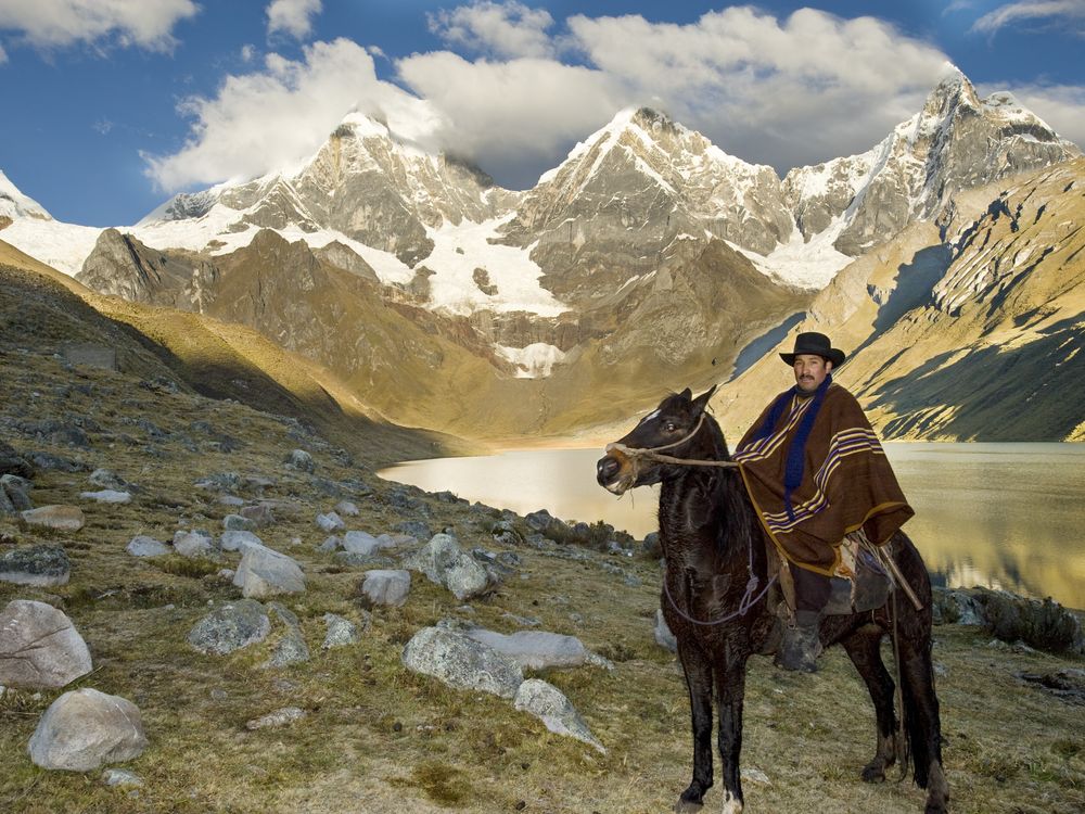Peruvian Cowboy (vaquero) on his horse at Lake Carhuacocha , reflection of Mount Yerupaja and Yerupaja Chico in Lake, Cordillera Huayhuish , Reserve Zone, Andes Mountains, Peru, model released
