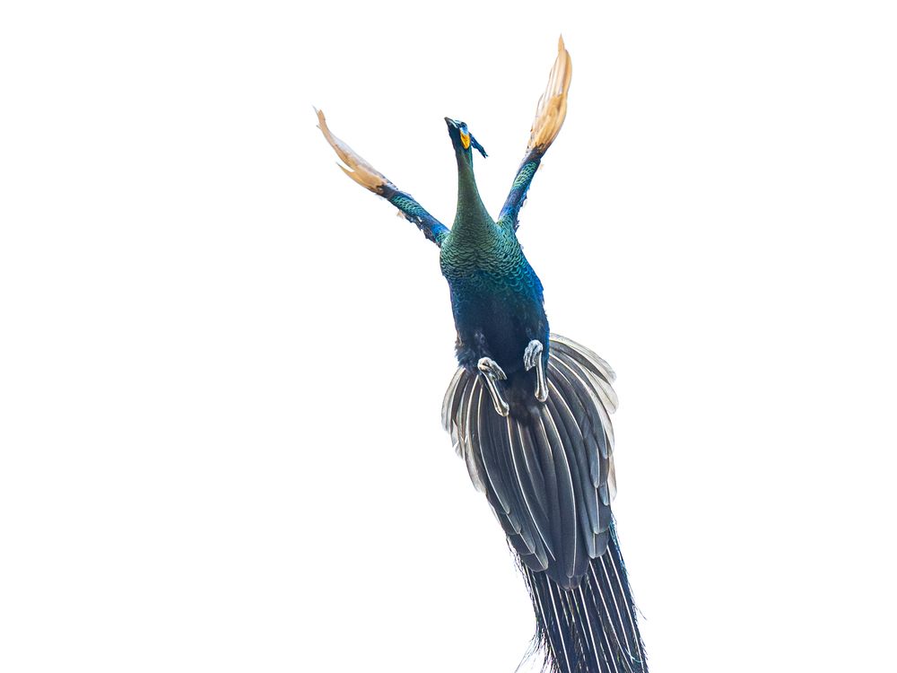 A peacock arrows through the sky as it takes flight