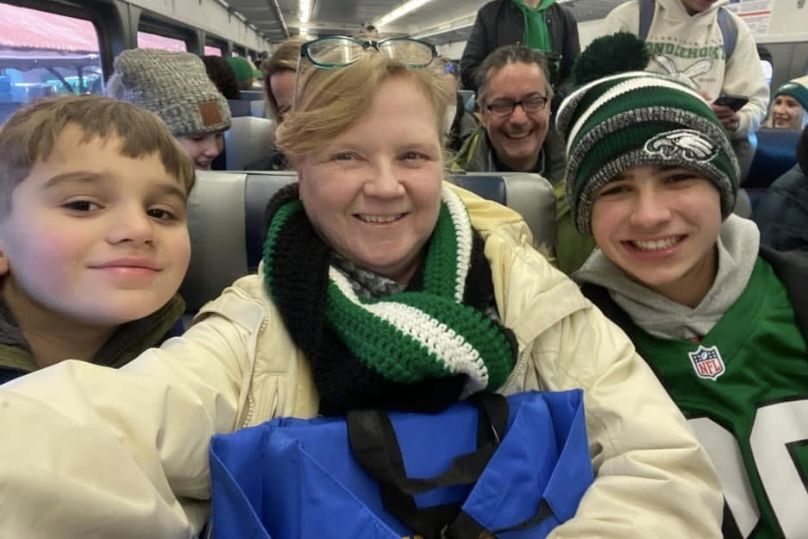 On the train on the way to Philly for eagles super bowl parade. Nanny and two grandsons.