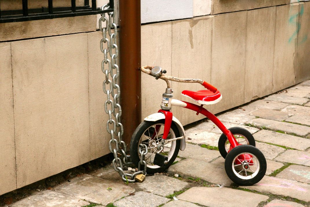 Photo of a tricycle chained outside a toy store in Old Town Bratislava, Slovakia. An ironic take on the measures humans take to protect their personal property.