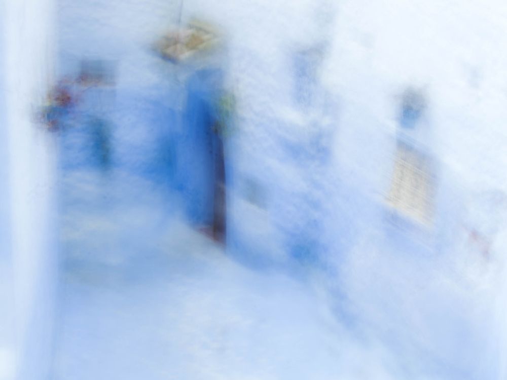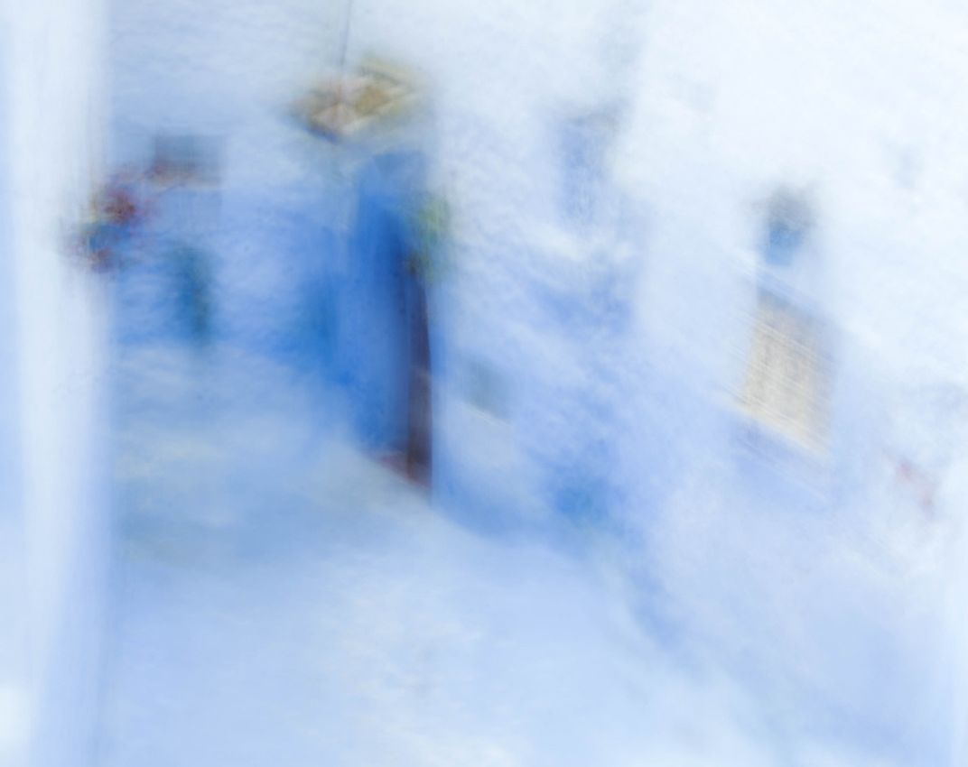 The phots shows a traditional street of a moroccan city (chefchaoun) caracterized by its blue houses