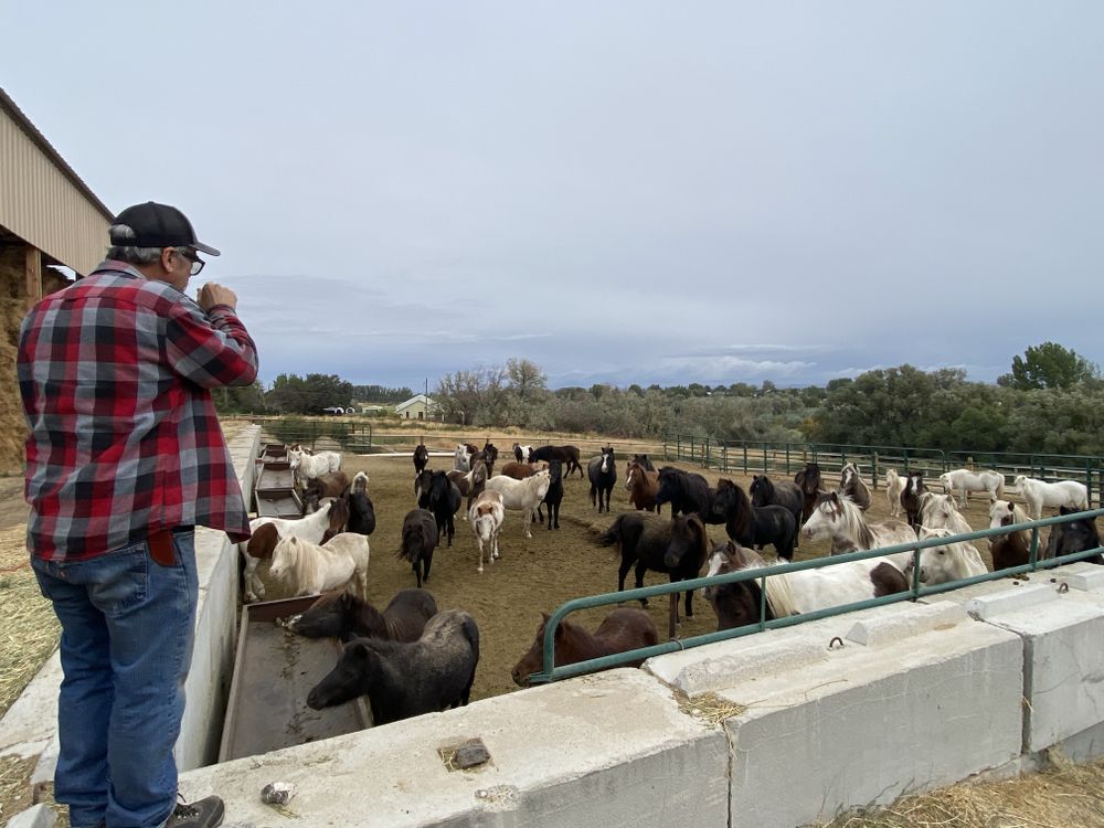 Miniature ponies in their pen while it over looks the valley while the man over looks them.