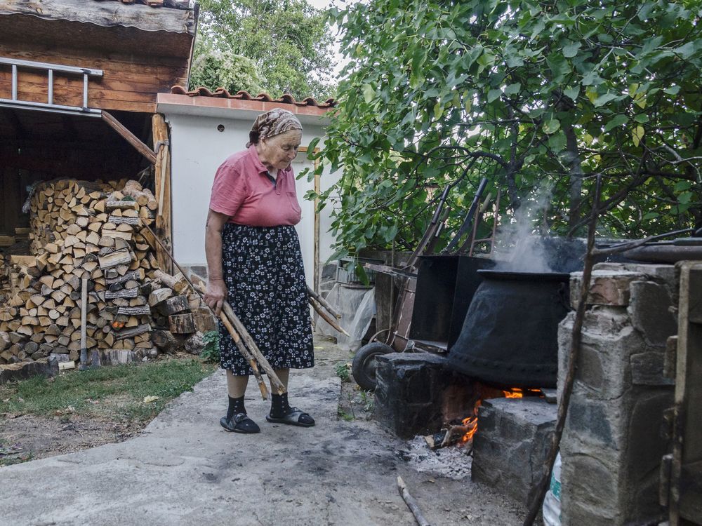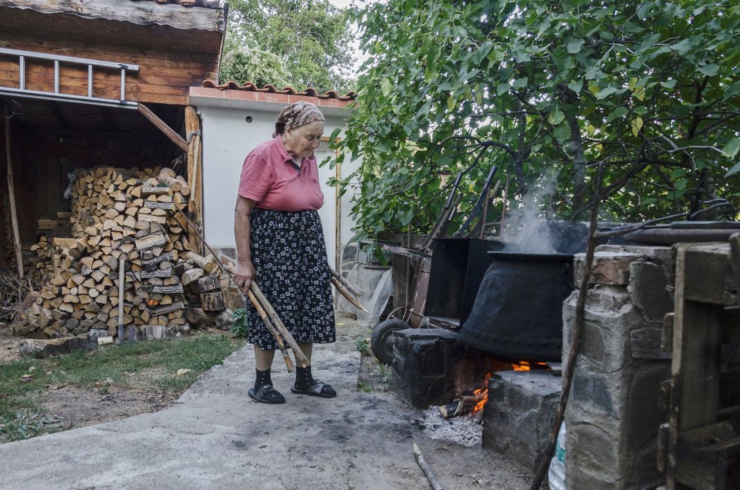 September is the month of home canning. The photo shows the moment of canning (boiling) jars of pickles. An elderly woman maintains the fire.