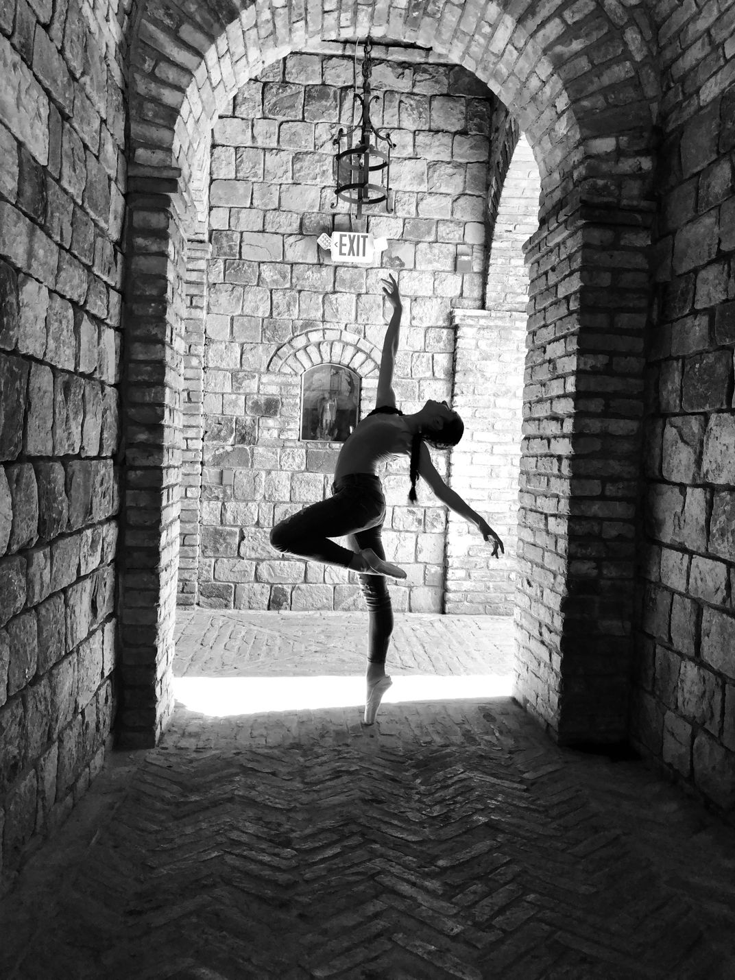 We were visiting, Castello di Amorosa, in Napa Valley. I snapped this picture with my phone of my daughter in one of the walkways. My daughter is 14 now and has been dancing ballet since she was 2 years old. Beautiful memory on a warm day in the castle.