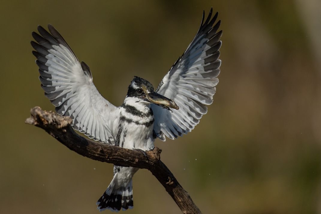 This Pied Kingfisher landed on this dead tree with a little fish it just caught.
