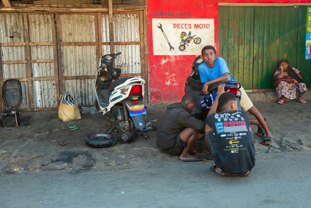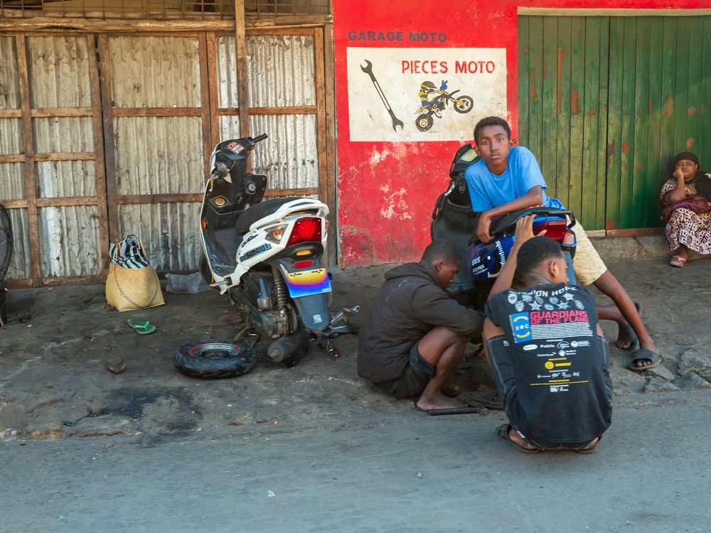 Young men fixing a scooter in front of a garage at Tolagnaro (Fort Dauphin).