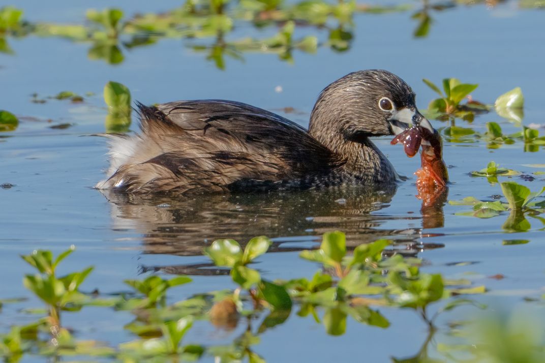 A Pied-billed Grebe snags one of its favorite meals - a crawdad!