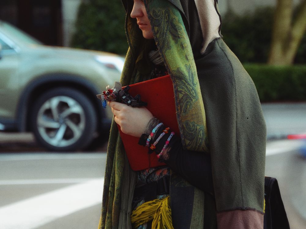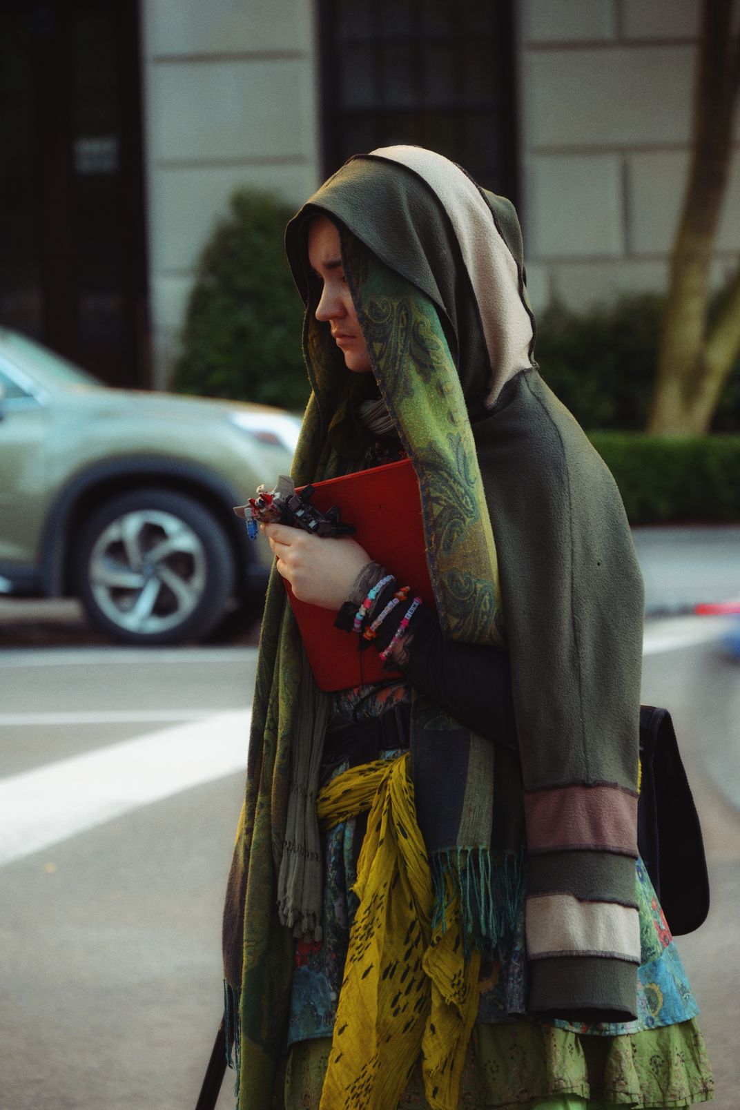 Outside the Metropolitan Museum of Art, where taxis slide past like restless fish and crowds move in drifting, accidental patterns, she stood completely still. Wrapped in layers of worn fabric, in greens and browns that had softened with time, she seemed untouched by the noise and wealth of Fifth Avenue. Her clothes were in shambles, yet she held a red notebook against her chest with a quiet and almost stubborn gentleness. She was watching a man sitting on the pavement nearby. He was holding a dying pigeon in his hands, cupping it the way someone might cradle a fragile memory they are not ready to release. The city kept rushing around them with stroller wheels and museum brochures flapping in the wind and the constant hum of traffic. But in the space between the two of them, a strange stillness formed. Not dramatic and not sentimental, simply a brief and precise pause in time. It felt like the moment when a record skips and the room forgets to breathe. For an instant they seemed to exist just outside the usual map of New York. Two strangers linked by a fading bird, their paths touching for only a breath before drifting apart again into the wide and restless current of the city. This photograph tries to hold that small moment of quiet, a tiny and almost invisible tenderness on Museum Mile.