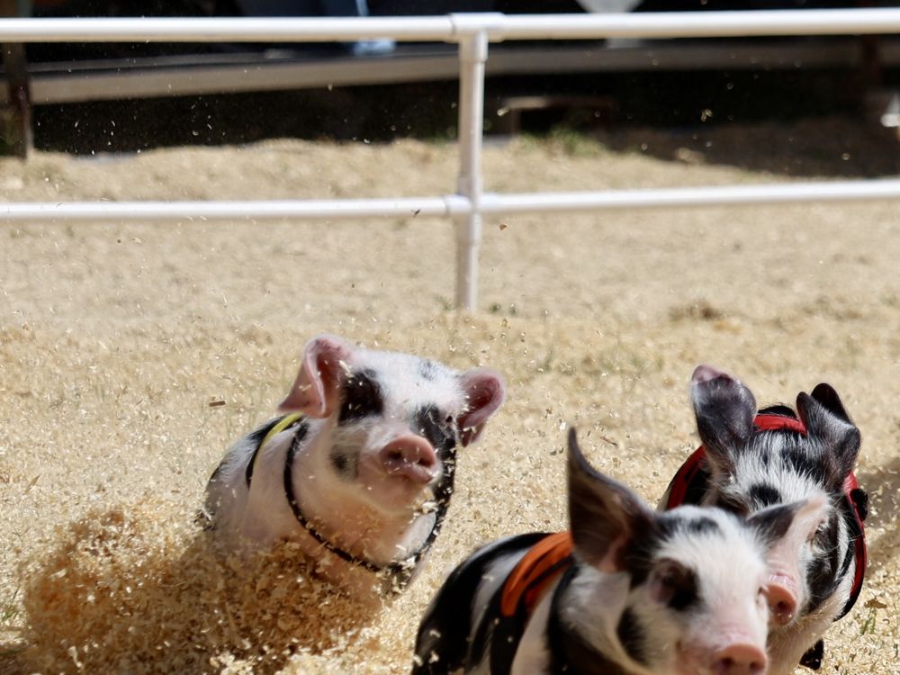 3 pigs race around the track (with a 4th one racing somewhere along the track with them) for a treat. These little piggies are Gloucestershire Old Spots pigs.