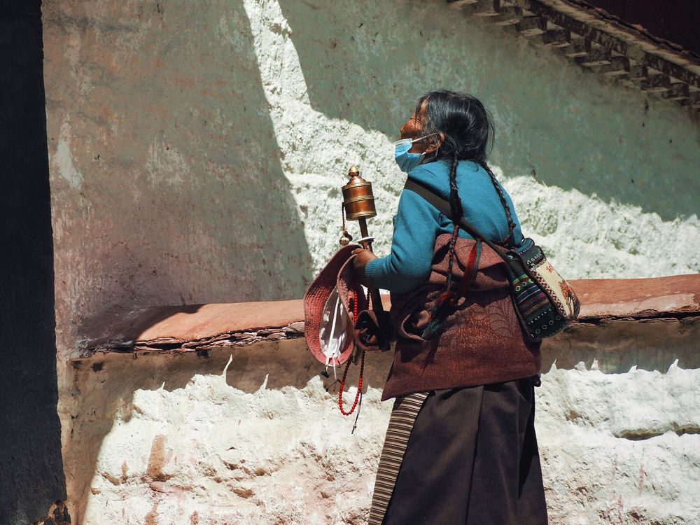 A woman was photographed on her way to pilgrimage, wearing ethnic clothing and looking forward
