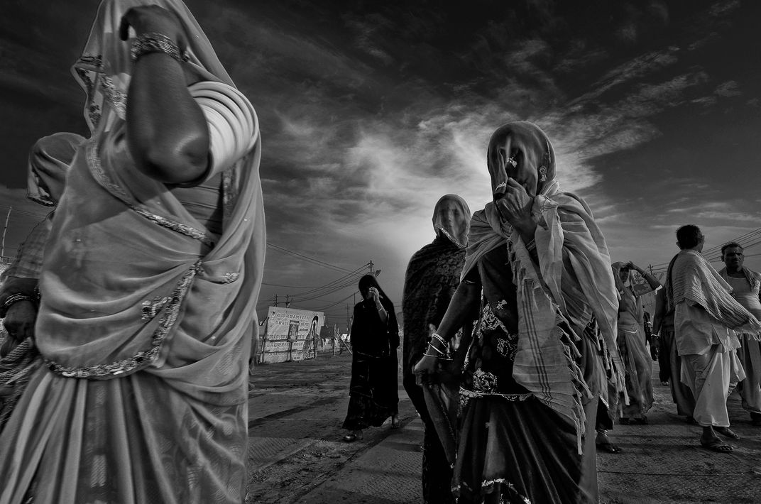 Pilgrims walk towards the sacred river Ganga in Allahabad, India.