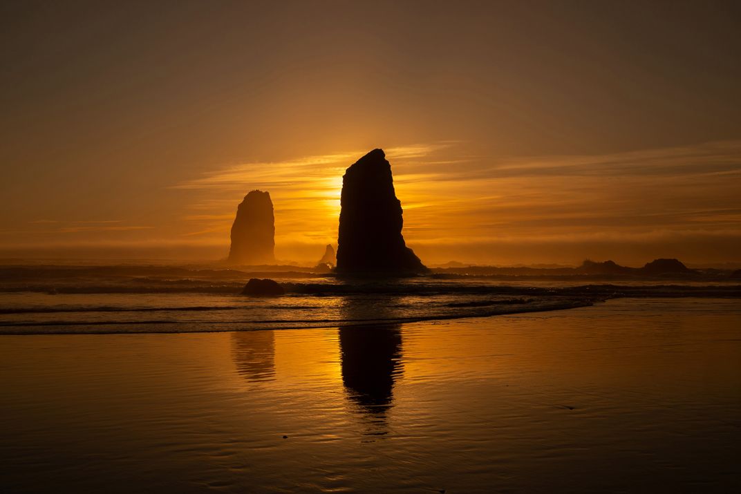 A dramatic sunset on the Oregon coast illuminating the rock formations at Cannon Beach