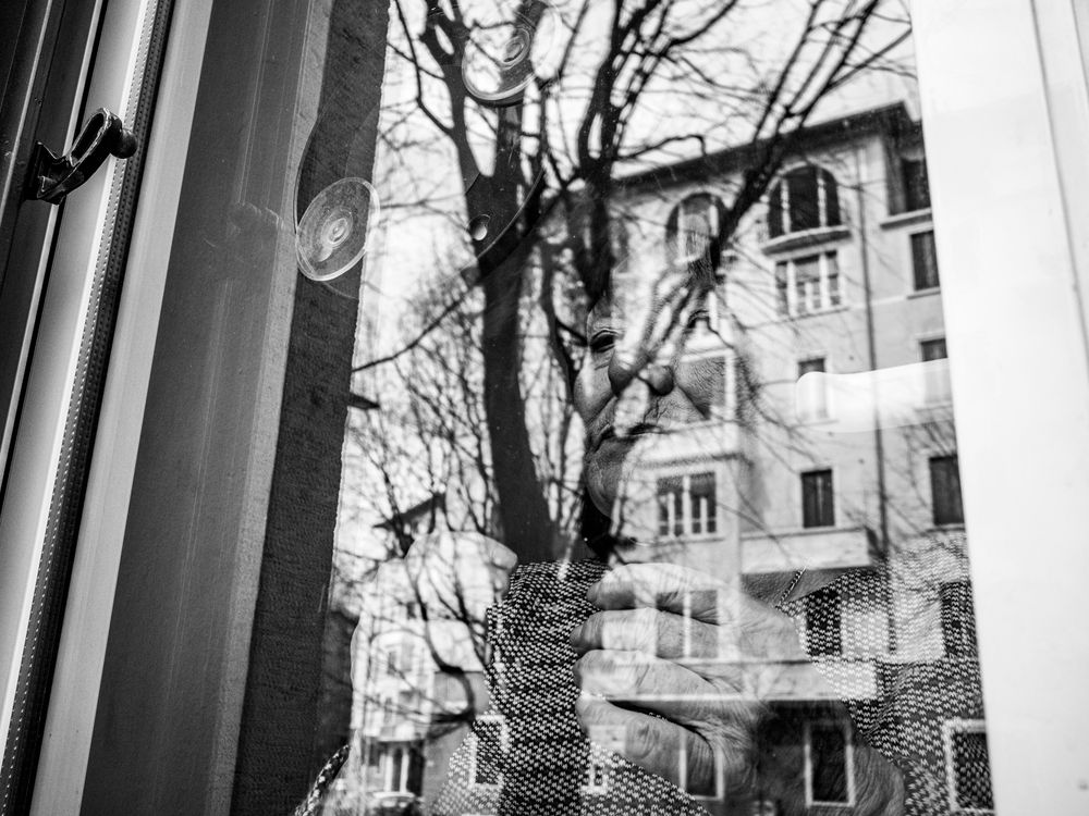Pina, 78, while applying makeup at the window. She lives in Corvetto, one of the most problematic neighbourhood in Milan, Italy, where, despite the international resources being allocated to modernise the city for the upcoming 2026 Winter Olympics, no aid is being given to the elderly. A large number of retired people live in Corvetto and often they're left alone.