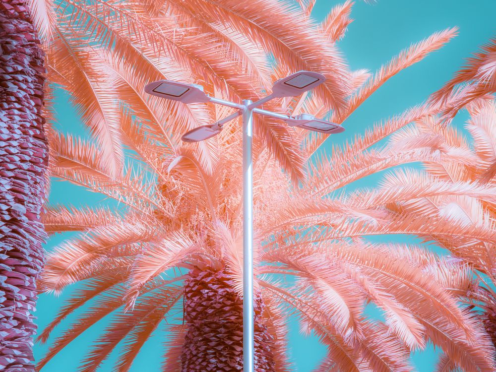 An urban lamp post stands amid towering palms in Arequipa, Peru, transformed by infrared 550nm photography into a vibrant pastel scene. The palms glow in shades of pink and orange, while the modern lamp post punctuates the surreal, dreamlike cityscape. The 550nm infrared filter brings out bold contrasts and exaggerated colors, emulating the style of classic false-color infrared film and making the blend of city and tropical nature appear otherworldly.