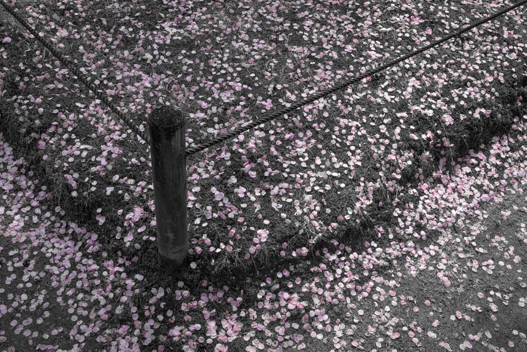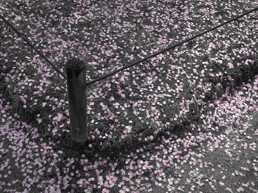 Cherry tree petals line the ground. Setting the petals apart from all else by converting the ground and rope fence to grayscale honors the beauty and delicacy of these beautiful flowers.