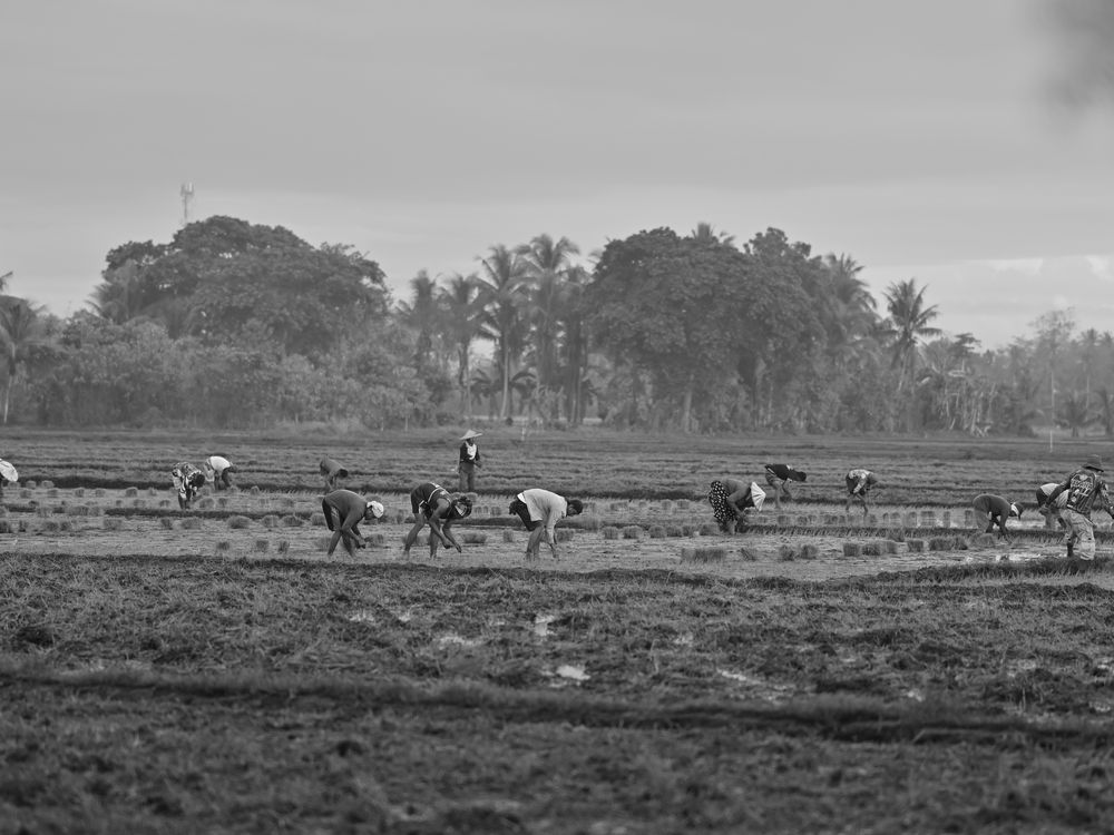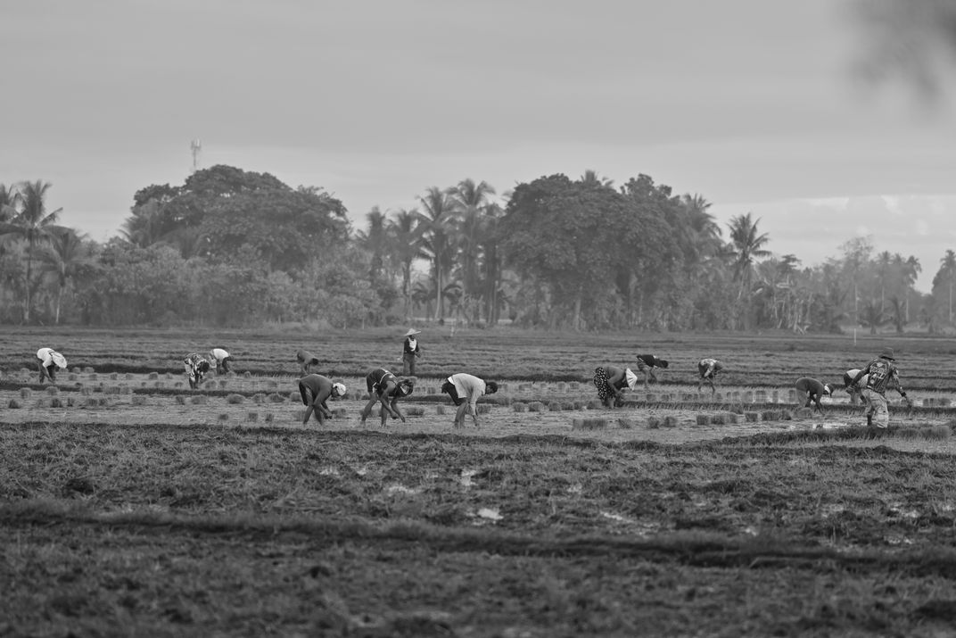Farm laborers manually transplanting rice seedlings in straight rows on a farm in Sultan Kudarat, Philippines. This is a traditional method of rice farming that is gradually being replaced by mechanical transplanting, leaving farm laborers without a livelihood in rice farming communities.