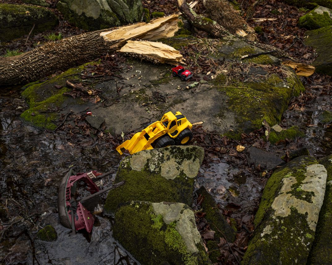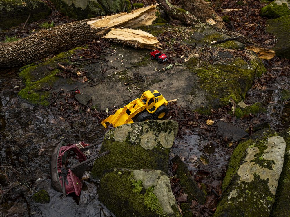 Children's toys left behind in a puddle in the woods. There is more room to play away from the city.